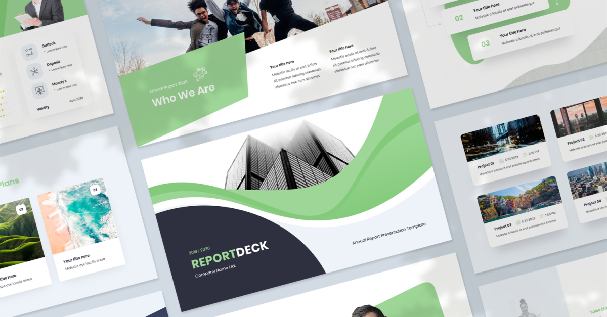 Bij het maken van de Reportdeck-presentatiesjabloon richtten we ons in de eerste plaats op bedrijven en individuen die behoefte hebben aan een stevig zakelijk rapport, en onze presentatie zal perfect werken als een jaarverslag, een projectrapport of een zakelijk rapport. Of u nu een bod uitbrengt op een belangrijke nieuwe klant of een zakelijke portefeuille, met deze Google Presentaties-sjabloon kunt u uw informatie en gegevens snel en efficiënt omzetten in een presentatie.
