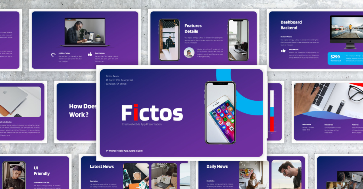 Fictos - Voorstel voor mobiele app Google Slides-presentatiesjabloon voor een start-up tot een geïmponeerde investeerder om hun geld in het project te investeren. Als je een trendy, eenvoudig en creatief bedrijf bent. deze sjabloon zou u het beste vertegenwoordigen. Verspil geen tijd, download gewoon dit professionele sjabloon en besteed de rest van de tijd aan de voorbereiding van uw toespraak. Alle afbeeldingen in de presentatie kunnen eenvoudig met slechts één klik worden ingevoegd. Gemaakt om uw bedrijfspresentatie te laten opvallen, een pijnloze en professionele uitstraling.