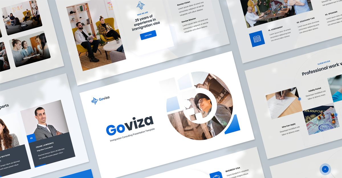 De presentatiesjabloon van Goviza is perfect voor bedrijven en personen die adviesdiensten voor immigratie verlenen, visumagenten die werkzaam zijn op het gebied van op werk en gezin gebaseerde immigratie en die helpen met diversiteitsvisa en terugkerende ingezeten visa. Of u nu pitcht voor een belangrijke nieuwe klant of een zakelijke portfolio maakt, met deze Google Presentaties-sjabloon kunt u uw informatie en gegevens snel en efficiënt omzetten in een presentatie.