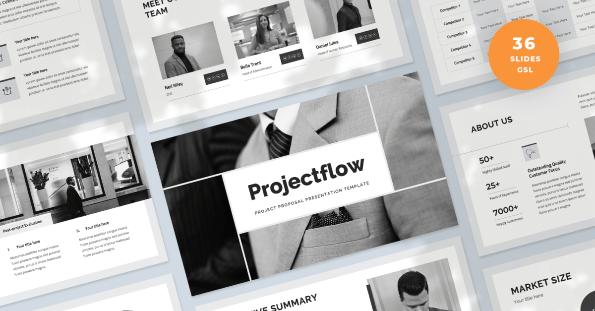 De Projectflow-presentatiesjabloon is perfect voor bedrijven en professionals die zakelijke voorstellen willen presenteren aan hun personeel/werknemers, hoger management, investeerders, partners of klanten. Dit is het perfecte presentatiesjabloon voor een zakelijk voorstel. Of u nu pitcht voor een belangrijke nieuwe klant of een bedrijfsportfolio maakt, met deze Google Presentaties-sjabloon kunt u uw informatie en gegevens snel en efficiënt in een presentatie omzetten.