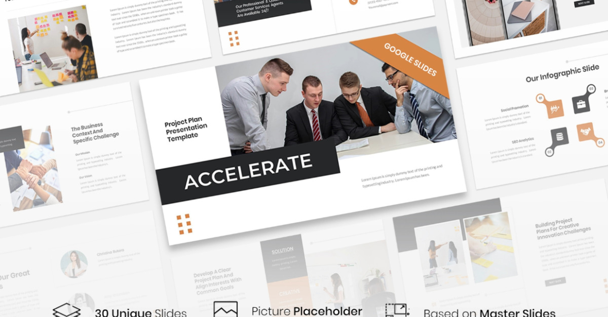 Accelerate - Projectplan Google Slides-sjabloon is geschikt voor het presenteren van alles wat met het projectplan te maken heeft. Deze presentatie kan echter worden aangepast voor zakelijke doeleinden.