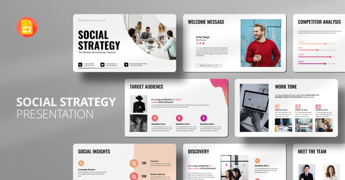 Betrokken sociale strategie Google SlidesSjabloon voor bedrijfsgroei