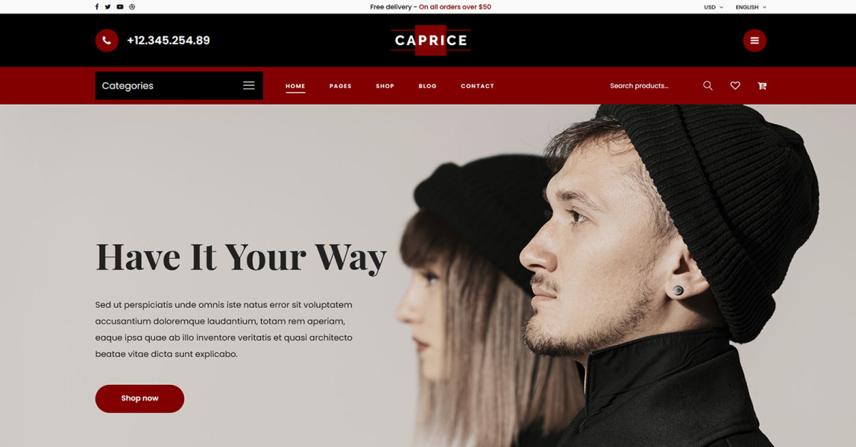 Caprice - Multifunctionele eCommerce HTML-sjabloon een moderne en professionele HTML5-sjabloon die perfect en geschikt is voor eCommerce-websites.