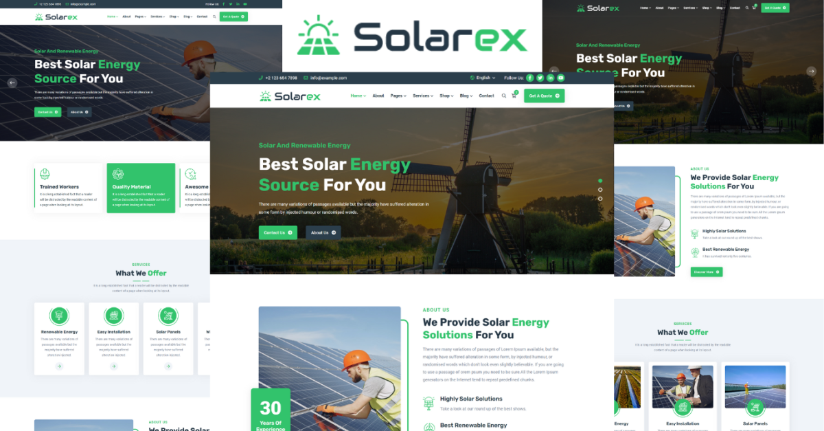 Solarex is een unieke, schone en creatieve HTML5-sjabloon ontworpen voor zonne-energie, hernieuwbare energie, alternatieve energie en groene energie of alle soorten energiegerelateerde sites. Solarex is de nieuwe, uitstekende, uiterst moderne HTML5-sjabloon. De sjabloonfuncties van Solarex zijn uw beste oplossing voor het maken van uw eigen unieke site. De Solarex-sjabloon zal supergemakkelijk aan te passen zijn en heeft een verbazingwekkende beoogde functionaliteit. Solarex is volledig responsief en compatibel met alle moderne browsers en mobiele apparaten. Bouw je eigen website met onze geweldige Solarex!.