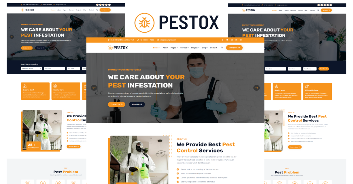 Pestox is perfect ontworpen voor alle soorten ongediertebestrijdingssites en bedrijven. De Pestox-sjabloon is erg handig voor ongediertebestrijding, ontsmetting, ontsmetting van bedrijven en gerelateerde websites. U kunt componenten gebruiken of verplaatsen, beginnend met de ene pagina en vervolgens naar de volgende pagina. Pestox heeft alle elementen die u echt nodig heeft voor een Pest Control Services-gerelateerde site met verbazingwekkende functionaliteit. Het unieke karakter van Pestox Template is te danken aan de ongelooflijk uitstekende ontwerpen en de eenvoudig te gebruiken website-indeling die de klanttevredenheid vergroot. Pestox is snel, lichtgewicht, schoon en bevat W3-geldige broncode.