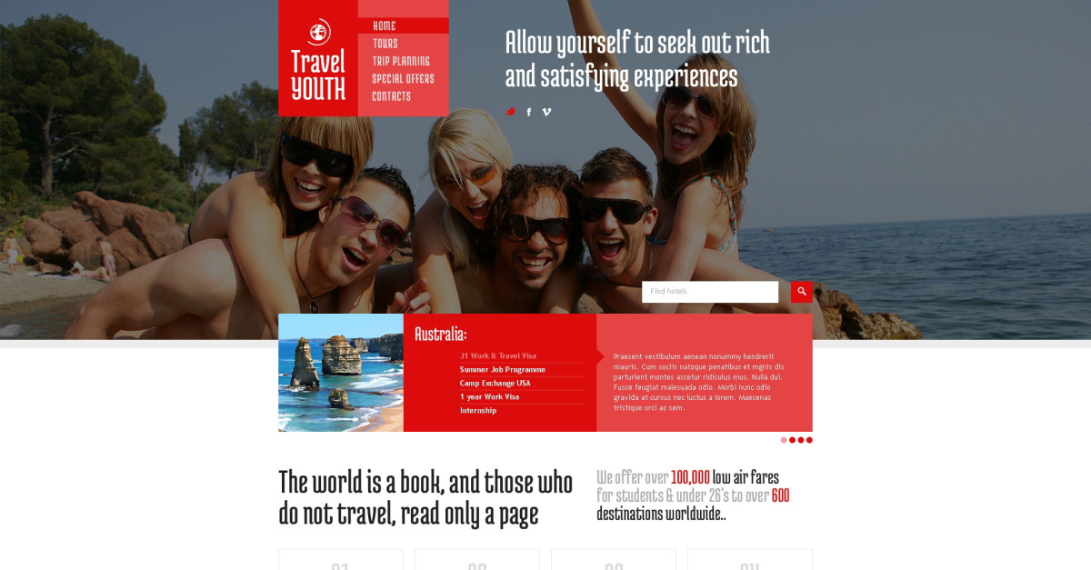 Gratis websitesjabloon voor reisbureaus is een HTML-ontwerp van hoge kwaliteit voor het bouwen van uw website voor reisbureaus. De sjabloon heeft een Bootstrap-framework, een volledig bewerkbare en responsieve lay-out, schone code en een handige structuur. Met al deze functies wordt het maken van uw website eenvoudig. Gebruik de Responsive Website Template voor reisbureaus om de uniciteit, klantgerichtheid en betrouwbaarheid van uw merk te benadrukken. Bied de beste services met een perfect ontwerp voor websites van reisbureaus.