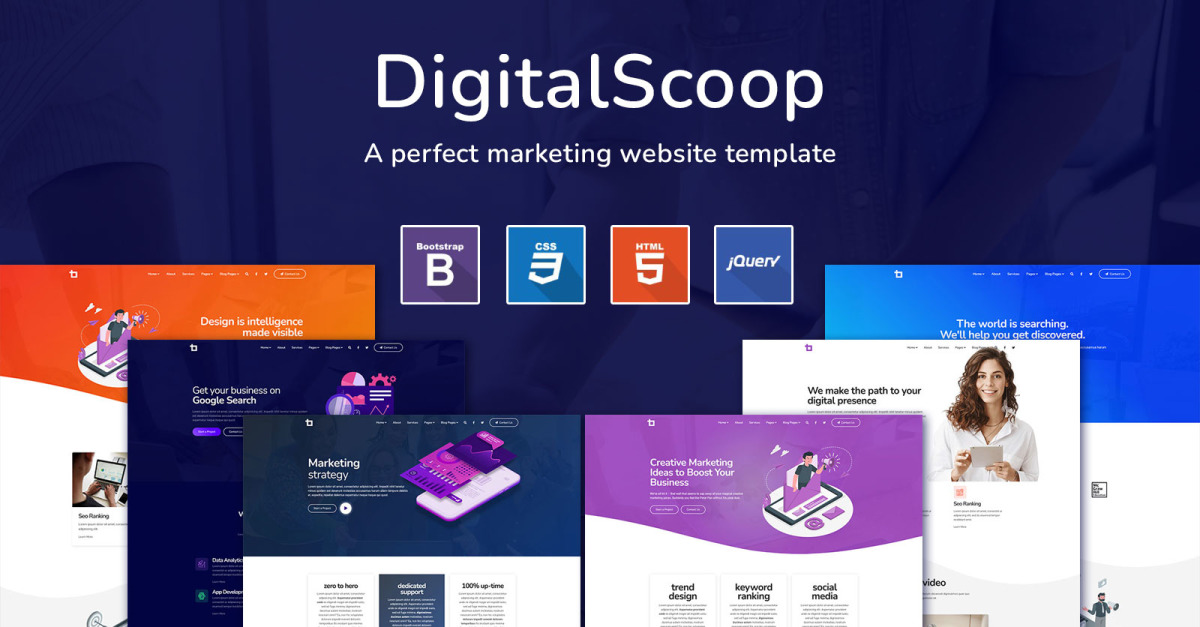 DigitalScoop - Marketing HTML5-sjabloon is perfect geschikt voor digitale marketingwebsites en brandingservices en online marketinggroepen. Het is een goed gemaakt, creatief en modern ontwerp voor soorten websites, zoals digitale marketing of online marketing voor winkels.