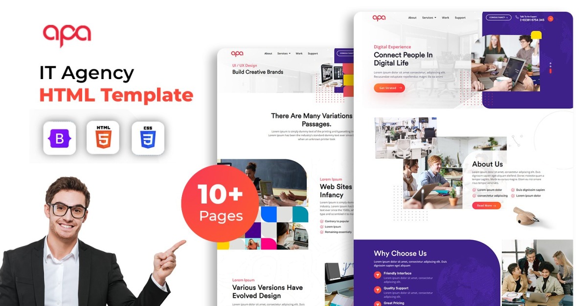 Op zoek naar een prachtig sjabloon om de website van uw start-up ontwerpbureau te bouwen? Maak je geen zorgen over de introductie van APA, een krachtige, schone, uitstekende websitesjabloon. U kunt er feilloos uw droombedrijfswebsite mee bouwen. APA is een perfecte keuze voor uw website voor ontwerp, ontwikkeling en digitale marketing. Het is ingebouwde Bootstrap 5, HTML5. Er zijn meer dan 10 responsieve pagina's in dit pakket. Alle lay-outs zijn zeer geschikt voor IT-servicegerelateerde bedrijfswebsites. De sjabloon kan eenvoudig worden aangepast en omgezet in dynamische stukken.