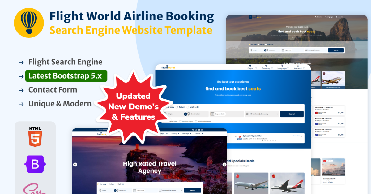 Update - Bootstarp v5.3.2 to v5.3.3, Fixes - Some Css & JS Fixes, Updated - twitter icon to x, Enhancement - Set bg via data attribute to banner images, Added - Flight Details Popup Section in Listing Page, Added - New Page - Forgot Password Page, Added - New Page - New Blog Page, Added - New Page - New Home Demo