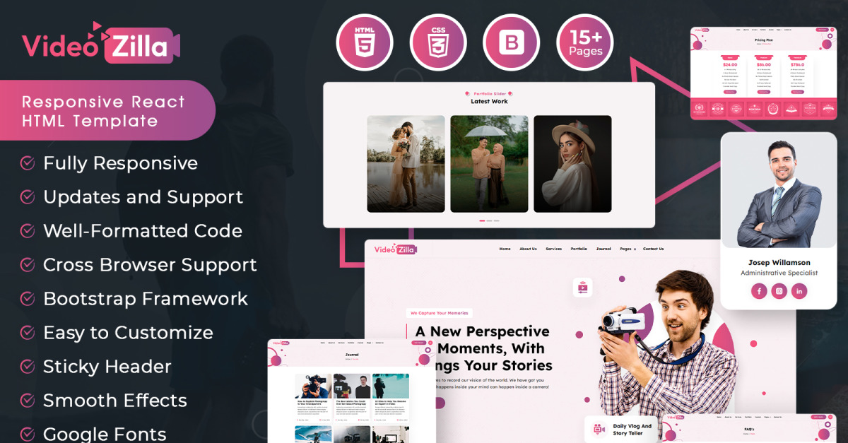 Videozilla is perfect voor degenen die zich bezighouden met videoproductie, videografie, foto-opnamen en fotobewerking. Het bevat meer dan 15 verschillende pagina's met schone en goed gestructureerde code.