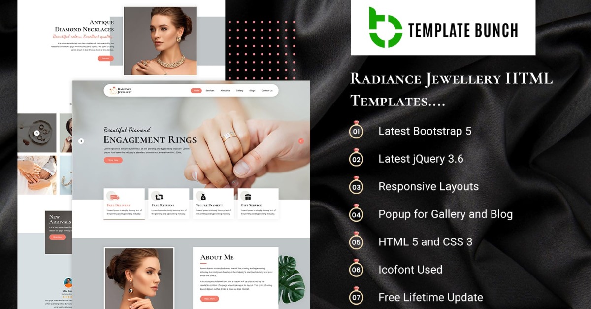 Radiance Jewellery is een HTML5-websitesjabloon die speciaal is ontworpen voor uw exclusieve sieradenproducten, zodat gebruikers een geweldige ervaring kunnen hebben bij het scrollen door pagina's. Deze HTML5-sjabloon heeft in totaal 11 pagina's die het uiterlijk van uw winkel verbeteren. Deze sjabloon is gebouwd in Bootstrap 5 met behulp van CSS3. Er is gebruik gemaakt van Google Fonts en icoFont om soepel te laden. Deze sjabloon heeft een responsieve lay-out die compatibel is met alle apparaten. Wij bieden 24*7 ondersteuning voor het geval u ergens vastloopt. Deze sjabloon heeft ook pop-ups voor galerijen en blogs.