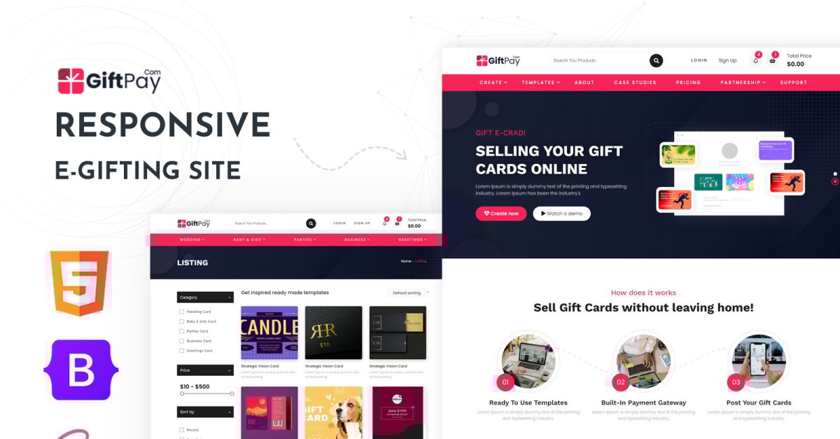 De Giftpay-websitesjabloon is ontworpen voor het online verkopen van verschillende soorten cadeaubonnen voor vele doeleinden, zoals bruiloften, Valentijnsdag, jubilea, Kerstmis en nog veel meer. De GiftPay-sjabloon is lichtgewicht, modern en zeer snel te laden. Het is oorspronkelijk gebouwd op het nieuwste Bootstrap 5-framework en maakt gebruik van SCSS. Met een moderne look en feel is de template zeer aantrekkelijk, zakelijk georiënteerd en kan hij het publiek zeer goed aanspreken.