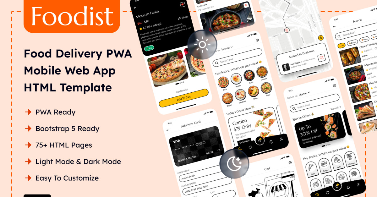 Foodist is de alles-in-één oplossing voor restaurants en ondernemers die op zoek zijn naar een krachtige en gebruiksvriendelijke mobiele app voor bezorging van eten (PWA). Met deze veelzijdige HTML-sjabloon kunt u een platform bouwen dat hongerige gebruikers verbindt met hun favoriete restaurants en een naadloze en handige mobiele bestelervaring biedt.