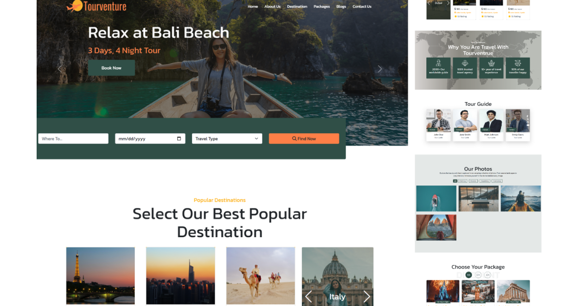 TourVenture is een HTML-sjabloon met veel functies, speciaal ontworpen voor reisbureaus, touroperators en vakantieplanners. Met zijn volledig responsieve, mobiele lay-out en speciale secties voor tours, bestemmingen en getuigenissen, biedt het een naadloze gebruikerservaring op alle apparaten. De geïntegreerde boekings- en contactformulieren stroomlijnen de communicatie, terwijl de schone, goed gestructureerde code zorgt voor eenvoudige aanpassing. Perfect voor het presenteren van luxe uitjes, avontuurlijke tours of familievakantiepakketten, stelt TourVenture u in staat om een professionele en visueel verbluffende online aanwezigheid te creëren waarmee bezoekers moeiteloos hun avonturen kunnen verkennen, plannen en boeken.