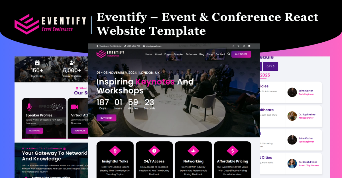 Eventify is een state-of-the-art React-websitesjabloon die is ontworpen om conferenties, summits, bedrijfsevenementen en branchebeurzen naar een hoger niveau te tillen. Gebouwd met React.js, CSS3 en JavaScript , zorgt het voor een razendsnelle, boeiende en volledig responsieve ervaring. Of u nu een zakelijke summit, tech expo, netwerkevenement of culturele bijeenkomst organiseert, Eventify voorziet u van de essentiële tools om een overtuigende evenementenwebsite te maken en de deelname van deelnemers te vergroten.