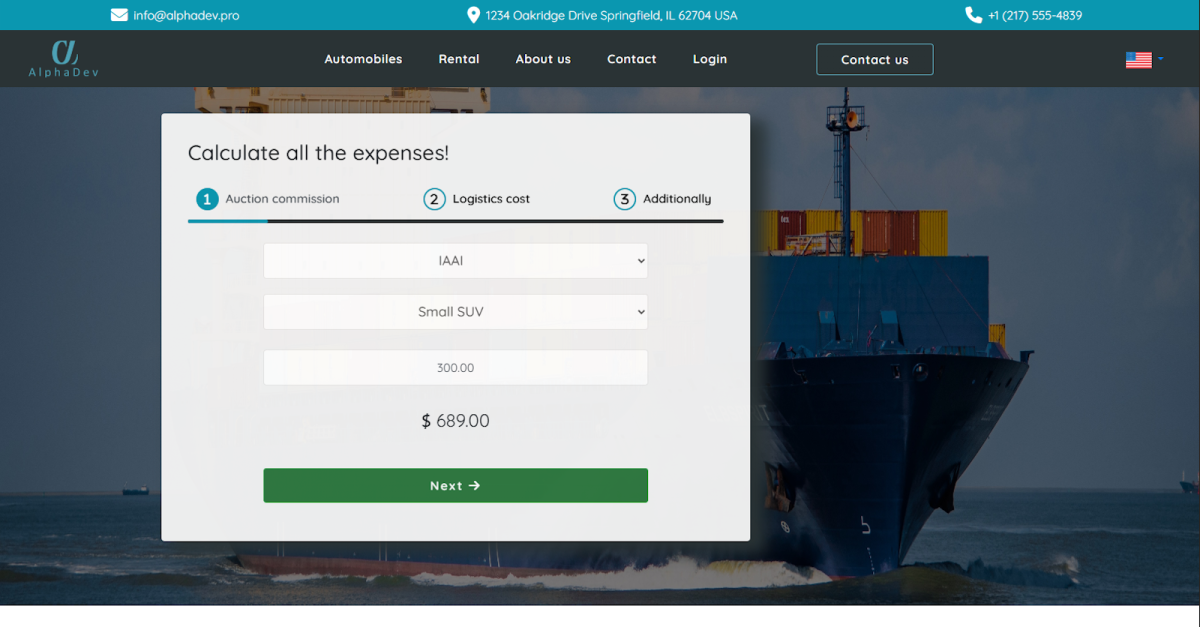 AutoMarketTemplate is een premium HTML-, CSS-, JavaScript- en Bootstrap-gebaseerde automotive template, ontworpen door specialisten met een focus op heldere code, geavanceerde visuals en gebruiksvriendelijke functionaliteit. Het heeft een modern, hoogwaardig ontwerp en bevat een dynamische homepage met een vloeiende logo-animatie bij het laden, een header met contactgegevens van het bedrijf, een professioneel logo, volledige navigatielinks en een taalkiezer. De opvallende Car Shipping Calculator biedt realtime schattingen op basis van voertuigtype, veilingcommissie, veilinghuis (bijv. Copart), voertuigkosten, motortype, verzekeringsvoorkeur, logistiek, stad van herkomst en bestemmingshaven. Gebruikers kunnen een gefilterde lijst met te koop aangeboden auto's bekijken, huuropties bekijken en meer te weten komen over het bedrijf via een strakke 'Over ons'-sectie met een aangepaste automotive-illustratie. Elke pagina bevat een uniforme voettekst met gedetailleerde bedrijfslocaties in Google Maps, inclusief telefoonnummers, adressen, openingstijden en links naar sociale media zoals Instagram en Facebook voor eenvoudige interactie.