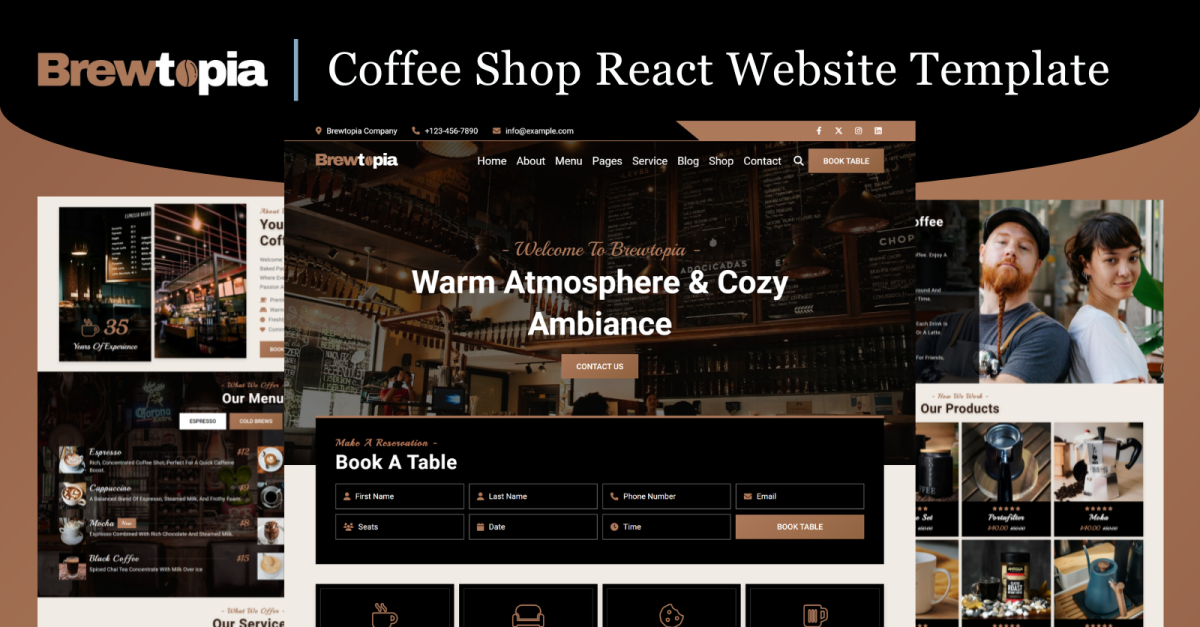 Brewtopia is een moderne en stijlvolle websitetemplate op basis van React, speciaal ontworpen voor koffiebars, cafés en speciaalzaken in dranken. Gebouwd met React.js, de nieuwste JavaScript- standaarden en CSS3, biedt het razendsnelle prestaties, een overzichtelijke lay-out en een volledig responsieve lay-out die er op elk apparaat perfect uitziet. Of u nu uw menu presenteert, speciale brouwsels uitlicht, klantrecensies deelt of online reserveringen aanneemt, Brewtopia biedt een verfijnde digitale ervaring die de online aanwezigheid van uw café vergroot en uw bedrijf laat groeien.