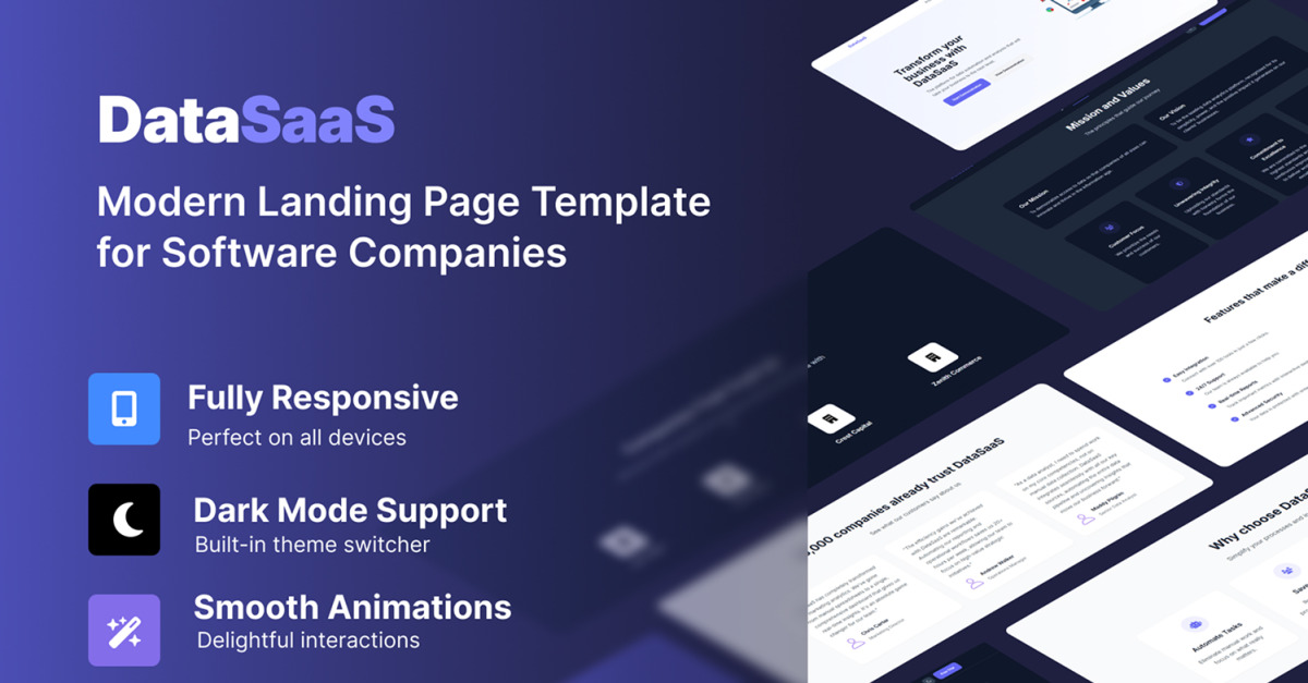 DataSaaS is een moderne en responsieve landingspaginasjabloon, ideaal voor Software as a Service (SaaS)-bedrijven, tech-startups en data-analyseplatforms. Met een strak en professioneel ontwerp is het ontworpen om bezoekers om te zetten in klanten en een uitzonderlijke gebruikerservaring te bieden op elk apparaat. De sjabloon bestaat uit een complete set pagina's met ondersteuning voor de donkere modus, vloeiende animaties en professionele ontwerpelementen.