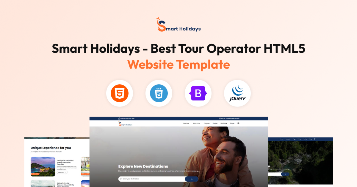 Smart Holidays – Beste HTML5-websitesjabloon voor touroperators is een modern, responsief en visueel aantrekkelijk ontwerp, speciaal ontworpen voor reisbureaus, touroperators en vakantieplanners. Gebouwd met de nieuwste HTML5- en CSS3-technologieën, biedt het een naadloze browse-ervaring op alle apparaten, waardoor uw reisbedrijf er professioneel en aantrekkelijk uitziet op elk schermformaat.
