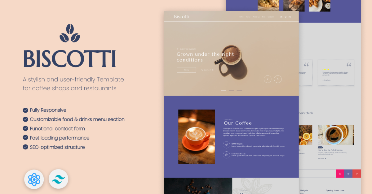 Biscotti is de perfecte oplossing voor ondernemers die een mooie, snelle en moderne website voor hun koffiebar of restaurant willen creëren met behulp van React en Tailwind CSS.