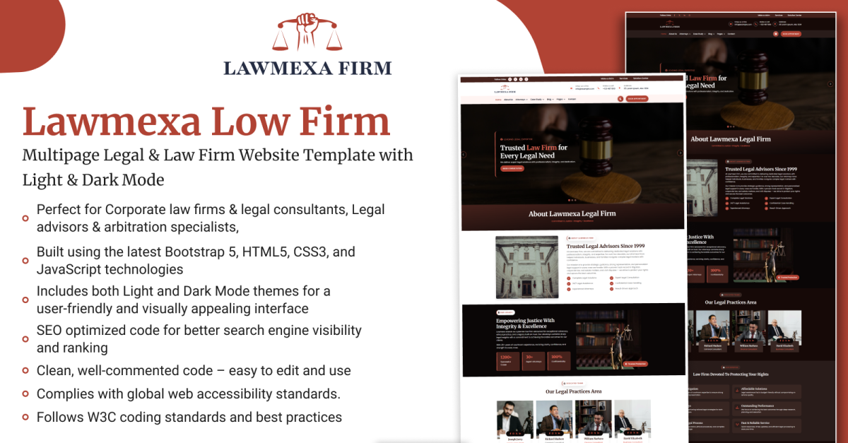 Lawmexa Firm is een krachtige, elegante en volledig responsieve HTML5-websitetemplate met meerdere pagina's, speciaal ontworpen voor advocatenkantoren, advocaten, juridisch adviseurs, juristen en bedrijfsjuristen. Gebouwd met Bootstrap 5, HTML5, CSS3 en JavaScript, biedt deze template een gepolijste en professionele uitstraling met een naadloze overgang tussen lichte en donkere modus, wat zorgt voor een optimale browse-ervaring op alle moderne apparaten. Met strakke lay-outs, verfijnde typografie en een sterke uitstraling stelt Lawmexa Firm u in staat om de waarden van uw kantoor te presenteren, juridische diensten te benadrukken, advocaten in de spotlight te zetten en casestudies helder en overtuigend te delen. Elke pagina is zorgvuldig gestructureerd om vertrouwen te wekken, de betrokkenheid te vergroten en uw kantoor te helpen waardevolle cliënten aan te trekken. Of u nu een advocatenkantoor voor bedrijven, een juridisch adviesbureau, een proceskantoor of een privépraktijk runt, Lawmexa Firm stelt u in staat om een sterke digitale aanwezigheid op te bouwen met verfijning en zelfvertrouwen.