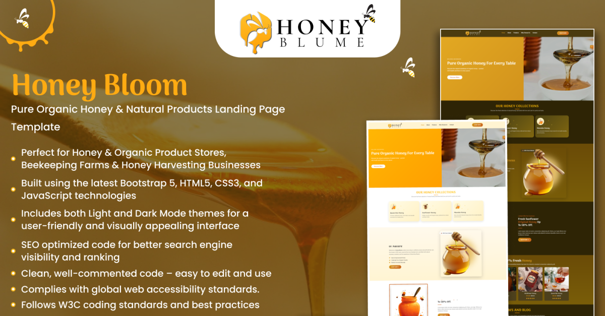 Honey Blume is een premium, op de natuur geïnspireerde en volledig responsieve HTML5-websitetemplate met meerdere pagina's, speciaal ontworpen voor biologische honingmerken, imkers, milieuvriendelijke boerderijen en bedrijven in natuurlijke producten. Deze template is ontworpen met een warme, aardse visuele stijl en benadrukt op prachtige wijze puurheid, versheid en vertrouwen. Gebouwd op het nieuwste Bootstrap 5-framework met HTML5, CSS3 en JavaScript, beschikt Honey Blume over een soepele overgang tussen lichte en donkere modus, strakke lay-outs en conversiegerichte UI-componenten. Elke pagina is zorgvuldig ontworpen om een aantrekkelijke gebruikerservaring te bieden, met behoud van hoge prestaties, toegankelijkheid en SEO-standaarden. Van productoverzichten en gedetailleerde productpagina's tot blogs, de checkout en aangepaste formulieren, Honey Blume is een complete front-end oplossing voor het online presenteren en verkopen van honing en biologische producten. Of u nu een honingboerderij, biologische winkel of een op imkerij gebaseerd huidverzorgingsmerk runt, Honey Blume helpt u uw bedrijf professioneel, natuurlijk en aantrekkelijk te presenteren op alle apparaten.