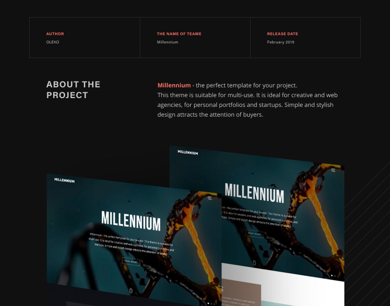 MILLENNIUM - de perfecte sjabloon voor uw project. Dit thema is geschikt voor meervoudig gebruik. Het is ideaal voor creatieve en webbureaus, voor persoonlijke portfolio's en startups. Eenvoudig en stijlvol ontwerp trekt de aandacht van kopers.