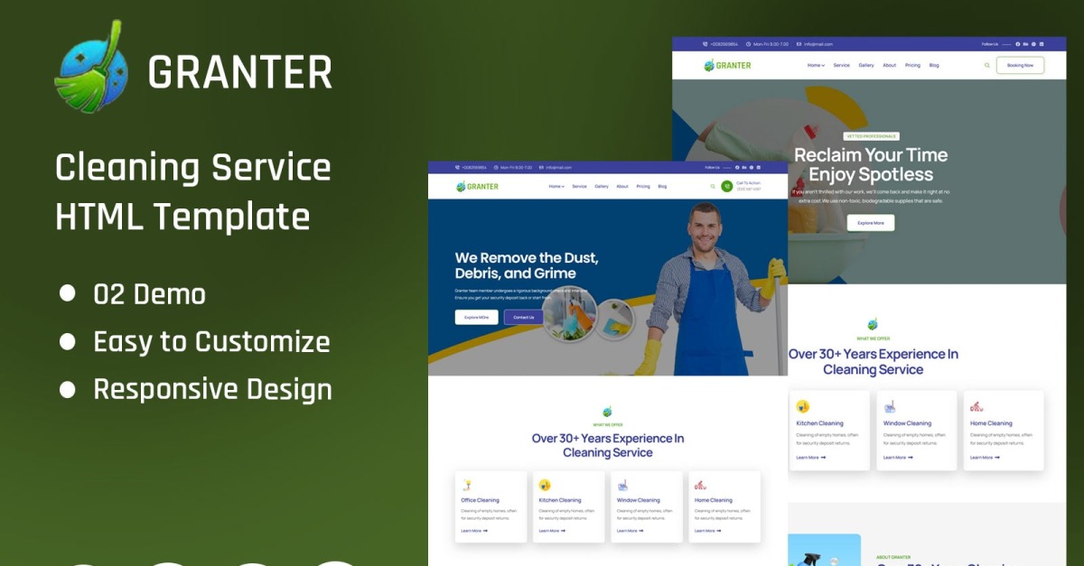 Granter is een elegant en stijlvol thema voor schoonmaakbedrijven, geschikt voor diverse schoonmaakdiensten, zoals huishoudelijke hulp, vloerreiniging, schoonmaakdiensten aan huis, schoonmaakbureaus en schoonmaakdiensten. Deze template heeft een overzichtelijke hiërarchie, gebaseerd op een duidelijke letterstructuur.