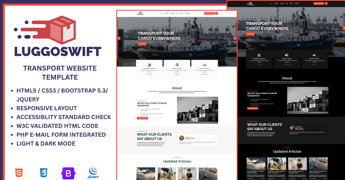 LuggoSwift is een moderne, feature-rijke en volledig responsieve HTML-sjabloon voor logistiek, transport en magazijn, ontworpen voor professionele logistieke, vracht- en verzendbedrijven. Het biedt een perfecte mix van functionaliteit, strak design en praktische bruikbaarheid - waarmee u een snelle, aantrekkelijke en betrouwbare online aanwezigheid voor uw transport- of bezorgbedrijf kunt opbouwen. LuggoSwift is gemaakt met HTML5, CSS3, Bootstrap 5 en jQuery en levert vloeiende animaties , geoptimaliseerde code en een naadloze gebruikerservaring op alle apparaten. Het wordt ook geleverd met geïntegreerde PHP-functionaliteit , waardoor de contactformulieren volledig functioneel en klaar voor implementatie zijn. Een opvallende functie is de schakelaar voor de donkere en lichte modus , waarmee gebruikers hun browse-ervaring kunnen personaliseren - een zeldzame en premium touch die de algehele moderne aantrekkingskracht van uw site verbetert. Of u nu een logistiek bedrijf, vrachtdienst, koeriersdienst, verzendbedrijf of magazijnbedrijf runt, LuggoSwift helpt u uw diensten te benadrukken, succesverhalen te delen, nieuwsupdates te publiceren en moeiteloos contact te leggen met klanten.