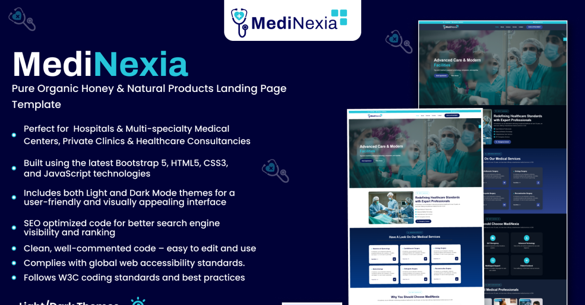 Medinexia is een moderne, overzichtelijke en zeer responsieve HTML5-landingspagina-sjabloon van één pagina, ontworpen voor ziekenhuizen, medische klinieken, gezondheidscentra, artsen, chirurgen, diagnostische laboratoria en telegeneeskundediensten. Deze professionele sjabloon is gebouwd met behulp van het nieuwste Bootstrap 5-framework met HTML5, CSS3 en JavaScript en bevat een ingebouwde schakelaar voor de lichte en donkere modus, wat een naadloze en toegankelijke ervaring biedt op alle apparaten. Met een vertrouwenwekkend ontwerp, medische typografie en zorgvuldig gestructureerde gebruikersinterface-secties helpt Medinexia u patiëntenzorg te benadrukken, diensten te presenteren en een sterke geloofwaardigheid in de gezondheidszorg op te bouwen. Van artsenprofielen tot afspraakboekingen en getuigenissen van patiënten, elke sectie is ontworpen om de betrokkenheid te vergroten en conversies te stimuleren. Of u nu een multidisciplinair ziekenhuis, een privékliniek, een medische praktijk of een online consultatieplatform beheert – Medinexia presenteert uw merk met helderheid, vertrouwen en professionaliteit.