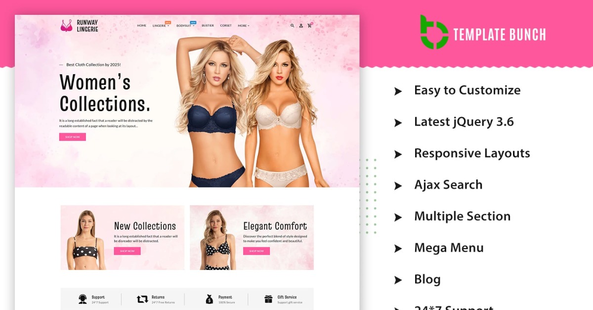 Runway Lingerie bevat kant-en-klare homepages, boxed en RTL-layouts en ondersteuning voor meerdere talen, zodat u een wereldwijd publiek kunt bedienen. Het CSS3-tabelloze ontwerp zorgt voor soepele prestaties, snelle laadtijden en een gestructureerde lay-out.