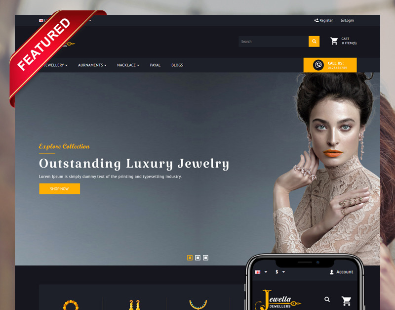 Jewella Online Store Het OpenCart Responsive-sjabloon. De sjabloon is zeer eenvoudig te installeren en aanpasbaar voor de eindgebruiker. Alle functies zijn overzichtelijk en eenvoudig te configureren met HTML /CSS. Jewella Online Store wordt geleverd met jQuery Library, CloudZoom, Nivo Slider en meer om uw online bedrijf te starten voor goede inkomsten uit de online winkel.