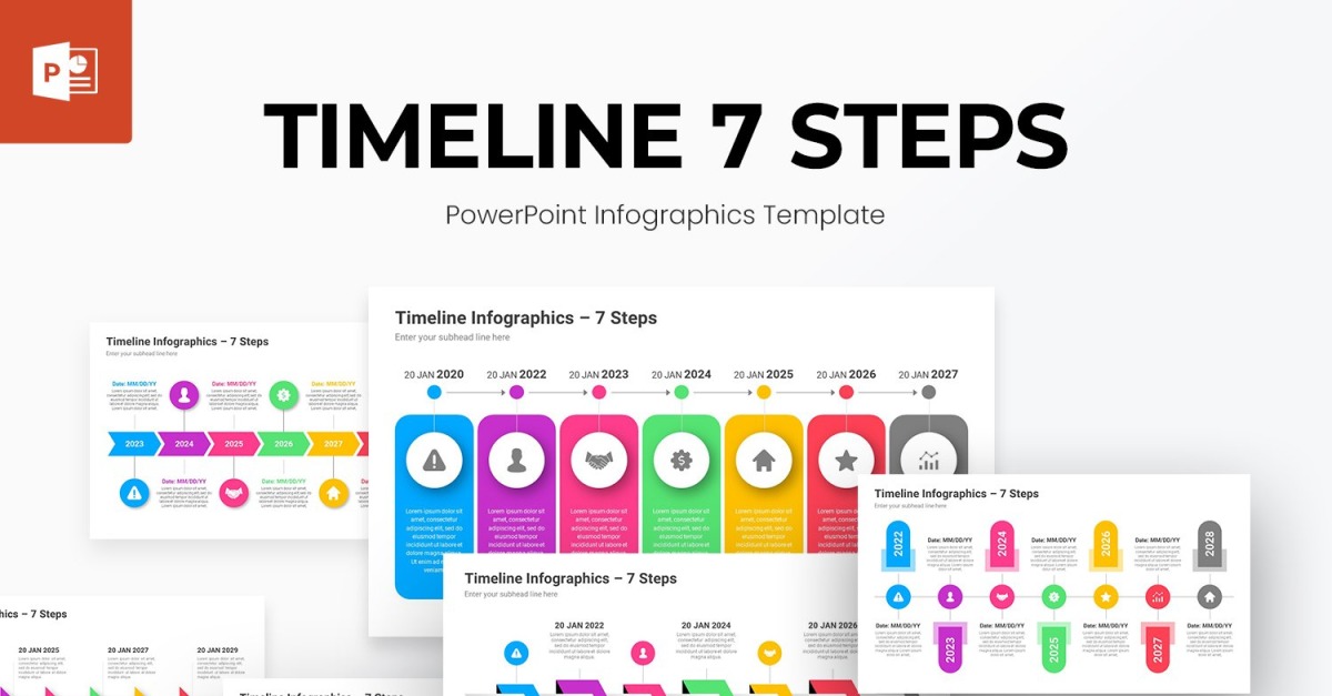 7 stappen tijdlijn infographics PowerPoint-sjabloon