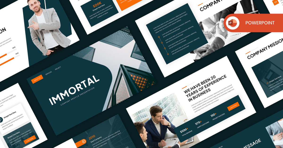 Introductie van **Immortal - Bedrijfsprofiel PowerPoint-sjabloon**