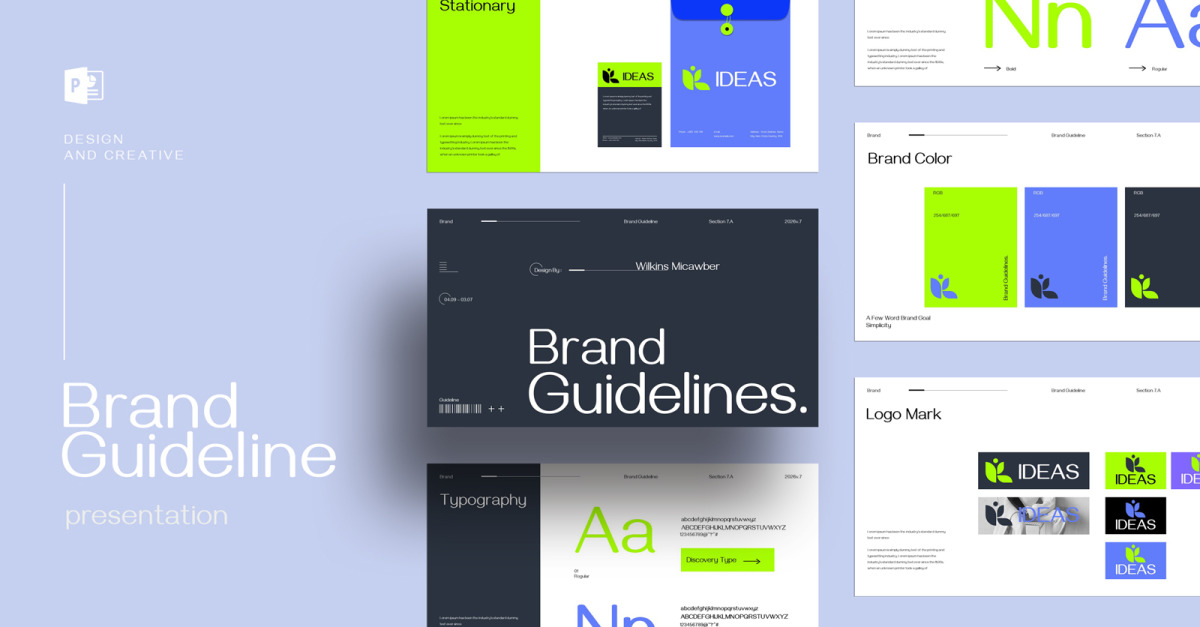 Deze merkrichtlijn-presentatiesjabloon bevat 25 nuttige dia's voor bedrijfsplannen en -processen, zoals bedrijfsintroductie, marktanalyse, producten en diensten, concurrentiestrategie, marketingplan, verkoopmethode, investeren, organisatie en managementteam, socialemediamarketing en nog veel meer.