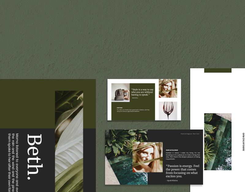 BETH is een elegant lookbook om je portfolio's in te plaatsen. Elke dia bevat verschillende soorten afbeeldingengalerij-indelingen die op een verleidelijke manier zijn verpakt. Het publiek zal gewoon genieten van het staren naar de presentatie omdat er niet al te veel elementen nodig zijn om de drukke blik te vermijden. Deze sjabloon is perfect voor iedereen die in een creatieve branche werkt en het geven van een presentatie belangrijk vindt.