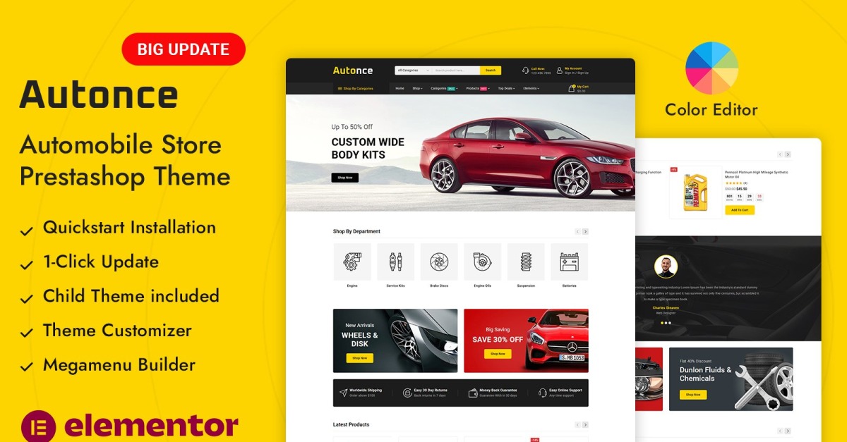 Autonce – Automobile Store PrestaShop Responsive Theme is een strak, modern en volledig functioneel e-commercethema, speciaal ontworpen voor auto-onderdelenhandelaren, autoaccessoireswinkels, autodealers, fietsonderdelenwinkels en leveranciers van autogereedschap. Met zijn gedurfde lay-out, heldere productpresentatie en duidelijke categoriestructuur biedt Autonce een professionele winkelervaring die het voor klanten gemakkelijk maakt om de juiste autoproducten te bekijken en te kopen.