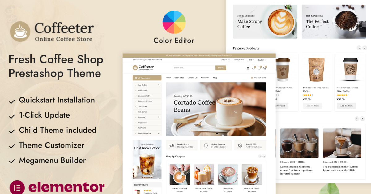 Coffeeter is een warm en doordacht PrestaShop Responsive Thema, speciaal ontworpen voor koffiebars, cafés, koffiebranderijen, drankenwinkels en ambachtelijke foodmerken. De lay-out kenmerkt zich door zachte kleurtinten, verfijnde typografie en visueel aantrekkelijke secties die het rijke aroma en karakter van premium koffie op natuurlijke wijze weerspiegelen. Of u nu gebrande bonen, gemalen melanges, koffiepads, koffiezetapparatuur, gearomatiseerde siropen, snacks of caféaccessoires verkoopt, met dit thema presenteert u uw producten op een heldere en inspirerende manier.