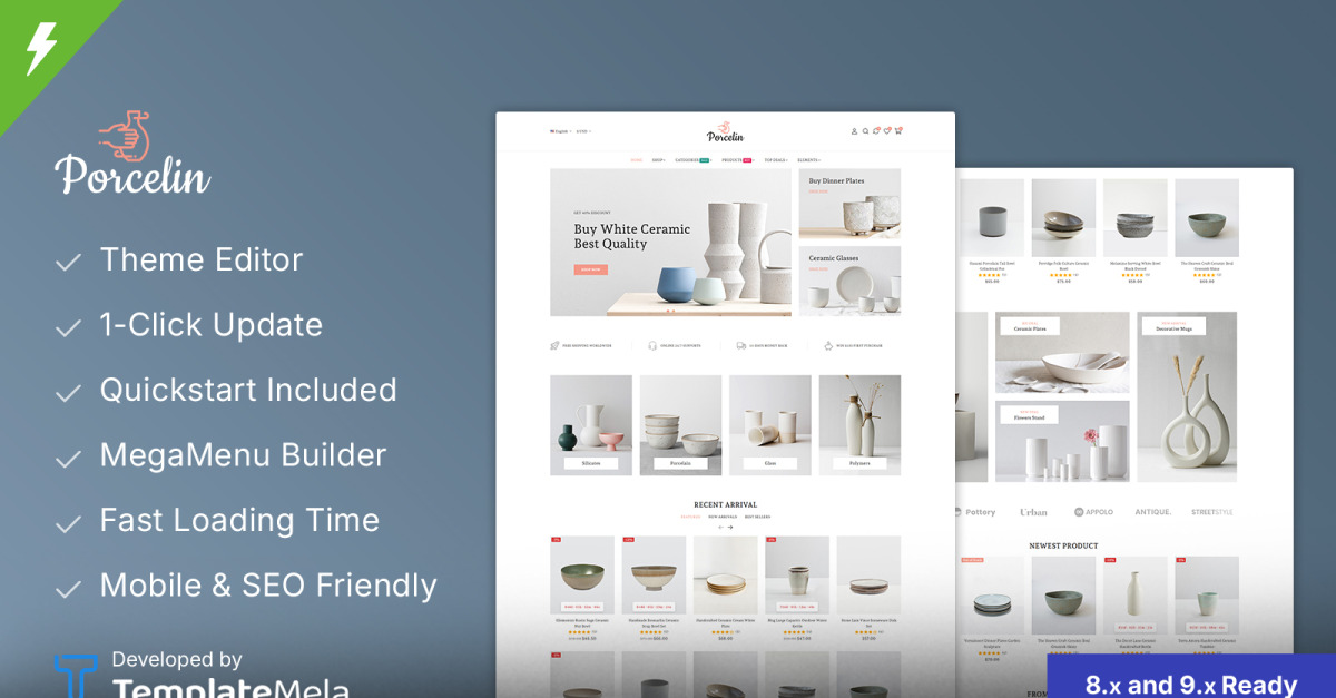 Creëer een moderne eCommerce-winkel met Porcelin - PrestaShop-sjabloon om uw artistieke producten, handgemaakte ambachten en soortgelijke producten tentoon te stellen en te promoten. Het thema is gemaakt met duidelijke en overzichtelijke code en zorgt voor een hoge laadsnelheid. Het thema is ook geoptimaliseerd voor de nieuwste SEO-maatregelen, alle schermresoluties en de nieuwste browsers. Het thema omvat een breed scala aan de nieuwste eCommerce-functies om een plezierige gebruikerservaring te bieden. Koop meteen Porcelin - een minimale maar moderne sjabloon en bouw zonder gedoe een verbluffende eStore.