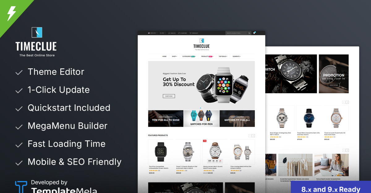 Timeclue is gebouwd met de krachtige Elementor Page Builder en stelt je in staat om pagina's moeiteloos aan te passen met een drag-and-drop-interface, zonder dat je hoeft te programmeren. De geïntegreerde Theme Customizer geeft je volledige controle over kleuren, lettertypen, banners en lay-outinstellingen in realtime, zodat je een winkelontwerp kunt creëren dat perfect aansluit bij je merkidentiteit. De geavanceerde Mega Menu Builder helpt je bij het organiseren van collecties, categorieën en aanbevolen producten voor een soepele en intuïtieve navigatie.