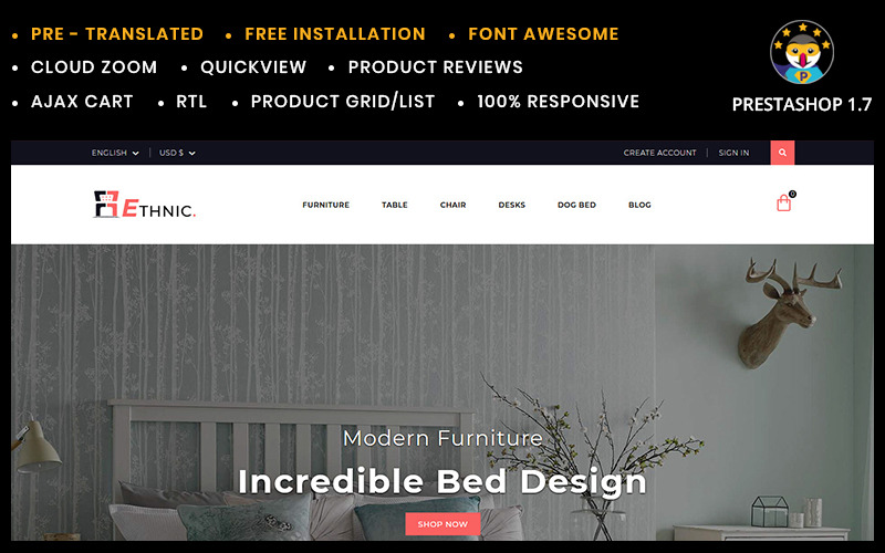 Etnische Prestashop multifunctionele sjabloon is ontworpen en ontwikkeld met behulp van de nieuwste eCommerce-trends en -functies . Deze sjabloon ondersteunt volledig alle modules en functies van Prestashop 1.7 in alle versies. De sjabloon-zip bevat sjablooninstallatie- en configuratiedocumentatie. Als u vragen heeft over deze sjabloon U kunt op elk gewenst moment contact met ons opnemen. Wij zijn 24*7 beschikbaar.