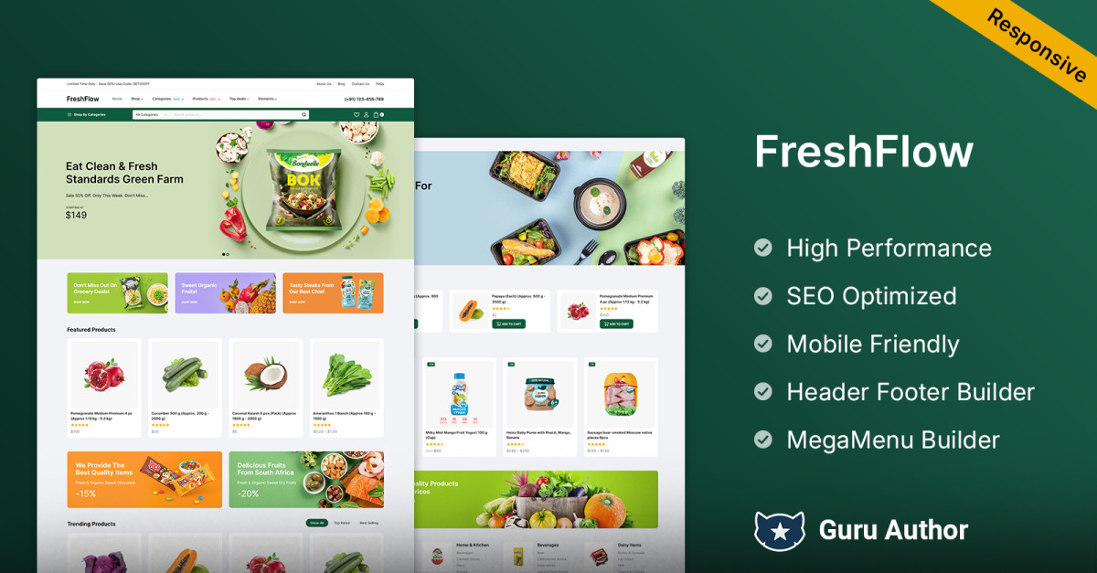 Freshflow is een strak, modern en veelzijdig WooCommerce-thema, ontwikkeld door Webdigify , speciaal ontworpen voor biologische winkels, supermarkten en bedrijven die zich richten op voeding. Freshflow is ontworpen voor een soepele en aantrekkelijke winkelervaring en biedt de perfecte mix van stijl, prestaties en functionaliteit.