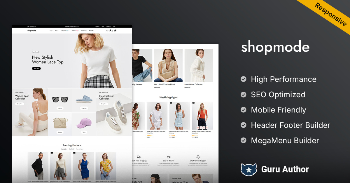 Shopmode heeft een strakke, eigentijdse lay-out die naadloos aansluit op desktops, tablets en mobiele apparaten. De visueel aantrekkelijke productpagina's, opvallende typografie en overzichtelijke content zorgen voor een meeslepende winkelervaring die klanten aantrekt en vasthoudt.