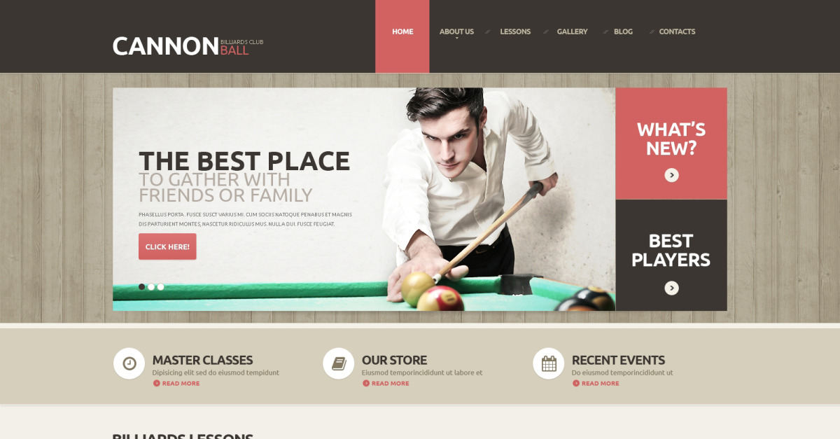 Download dit gratis responsieve WordPress-thema voor biljart met één klik. Dankzij het nichespecifieke ontwerp past het uitstekend bij websites van clubs, salons en bordspellen. ⏩ WordPress 3.0 en hoger ⏩ meerdere pagina's ⏩ voorbeeldafbeeldingen en inhoud.