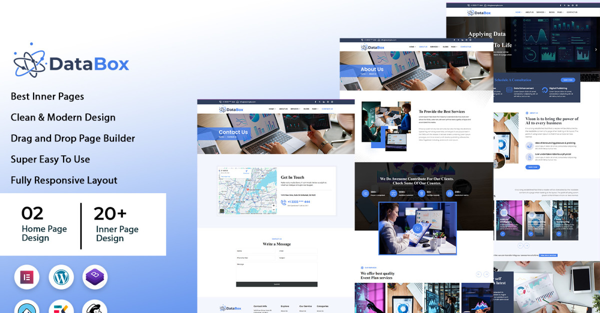DataBox is een krachtig, feature-rijk WordPress-thema dat speciaal is ontworpen voor data science, analytics en tech-gerichte bedrijven. Dit thema is perfect voor app-ontwikkelaars, bedrijfseigenaren en individuen. Het biedt aanpasbare lay-outs, strakke ontwerpen en geavanceerde tools om een opvallende website te maken. Met DataBox krijgt u responsieve sjablonen, naadloze integratie met datavisualisatieplug-ins en snel ladende pagina's. Het is een ideale keuze voor het presenteren van complexe data-inzichten. Verhoog uw online aanwezigheid en boei uw publiek door uw visie vandaag nog om te zetten in een professionele website met DataBox!