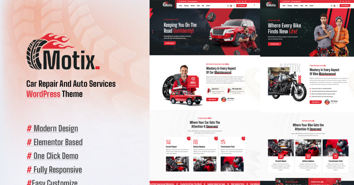 Motix is een modern, responsief en zeer aanpasbaar WordPress-thema, speciaal ontworpen voor autodiensten, autoreparatiebedrijven en aan de auto-industrie gerelateerde industrieën. Of u nu een autogarage, garage, autowerkplaats, autodealer of autospuiterij runt, Motix is de perfecte oplossing om uw bedrijf online te presenteren.