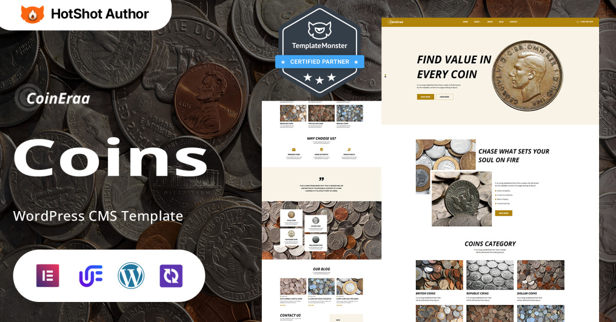 CoinEraa is een prachtig vormgegeven WordPress-sjabloon, ontworpen voor numismaten, muntenverzamelaars, handelaren in zeldzame munten, musea en veilinghuizen. Of u nu een hobbyist bent die zijn verzameling tentoonstelt, een professionele handelaar die zeldzame munten verkoopt of een historicus die de geschiedenis van munten documenteert, dit thema biedt het perfecte platform om een elegante en veelzijdige website te maken.