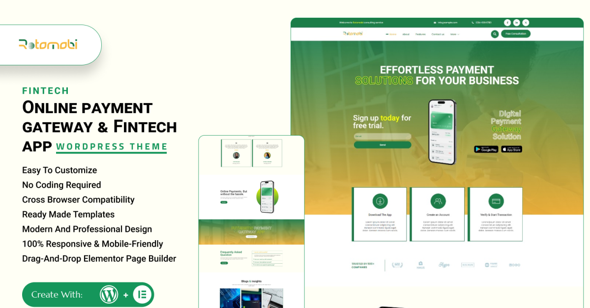 RotoMobi is een strak, veilig en krachtig WordPress-thema, ontworpen voor betalingsgatewayplatforms, fintech-apps, online bankdiensten, wallet-apps en startups in de financiële technologie. Of je nu een digitale wallet, een online overschrijvingsoplossing of een volwaardig fintechmerk lanceert - RotoMobi helpt je je diensten met vertrouwen en stijl te presenteren.