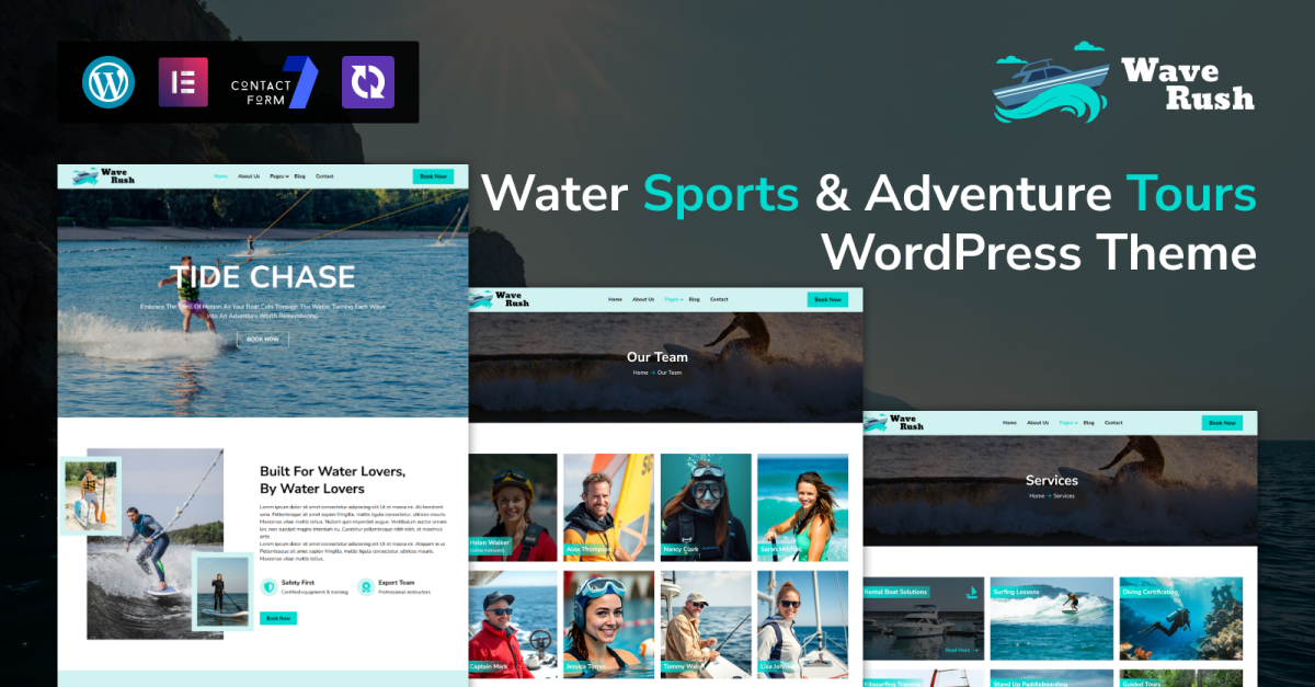 WaveRush is een actiegericht WordPress-thema, speciaal ontwikkeld voor watersportclubs, surfscholen, bootverhuurbedrijven en touroperators. Met een gedurfd, op de oceaan geïnspireerd ontwerp en een intuïtieve lay-out maakt WaveRush het gemakkelijk om je diensten te presenteren – van surflessen en jetskiverhuur tot duiktrips en teamcoaching.