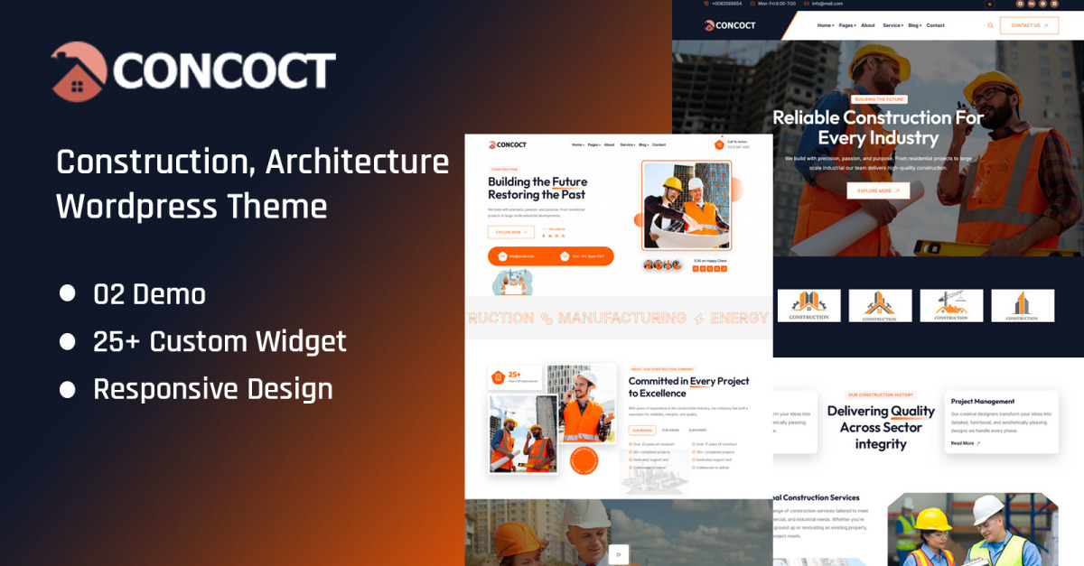 Concoct is een krachtig en verfijnd WordPress-thema, speciaal ontwikkeld voor bouwbedrijven, aannemers, architectenbureaus, renovatiebureaus en industriële dienstverleners . Met zijn strakke designtaal en professionele structuur stelt Concoct u in staat uw projecten, diensten en merkidentiteit vol vertrouwen te presenteren. Het thema is gebouwd volgens moderne webstandaarden en zorgt ervoor dat uw website er indrukwekkend uitziet en feilloos functioneert op alle apparaten.